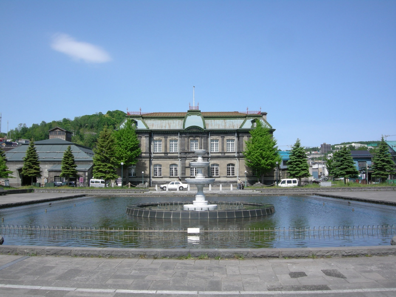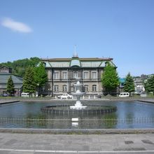 国指定重要文化財である旧日本郵船小樽支店と、小樽運河の間にあり、園内には明治・大正の石造倉庫を復元した休憩棟と遊戯棟のほか、中央部には当時の「船入澗」形状をした噴水池があります。総合博物館に行く途中にあったので立ち寄りました。旧日本郵船小樽支店の建物を撮影するのにちょうどよいスポットになっています。