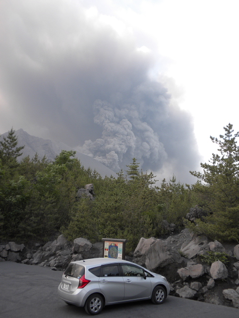 ここからさらに20分ほど走ると噴煙を上げている桜島がよく見えるスポット、有村溶岩展望所につきました。時間は、午後4時半ごろでしたがちょうどこの時間の有村溶岩展望所は桜島の風上になっていたようで、噴火の様子をはっきりとみることができました。