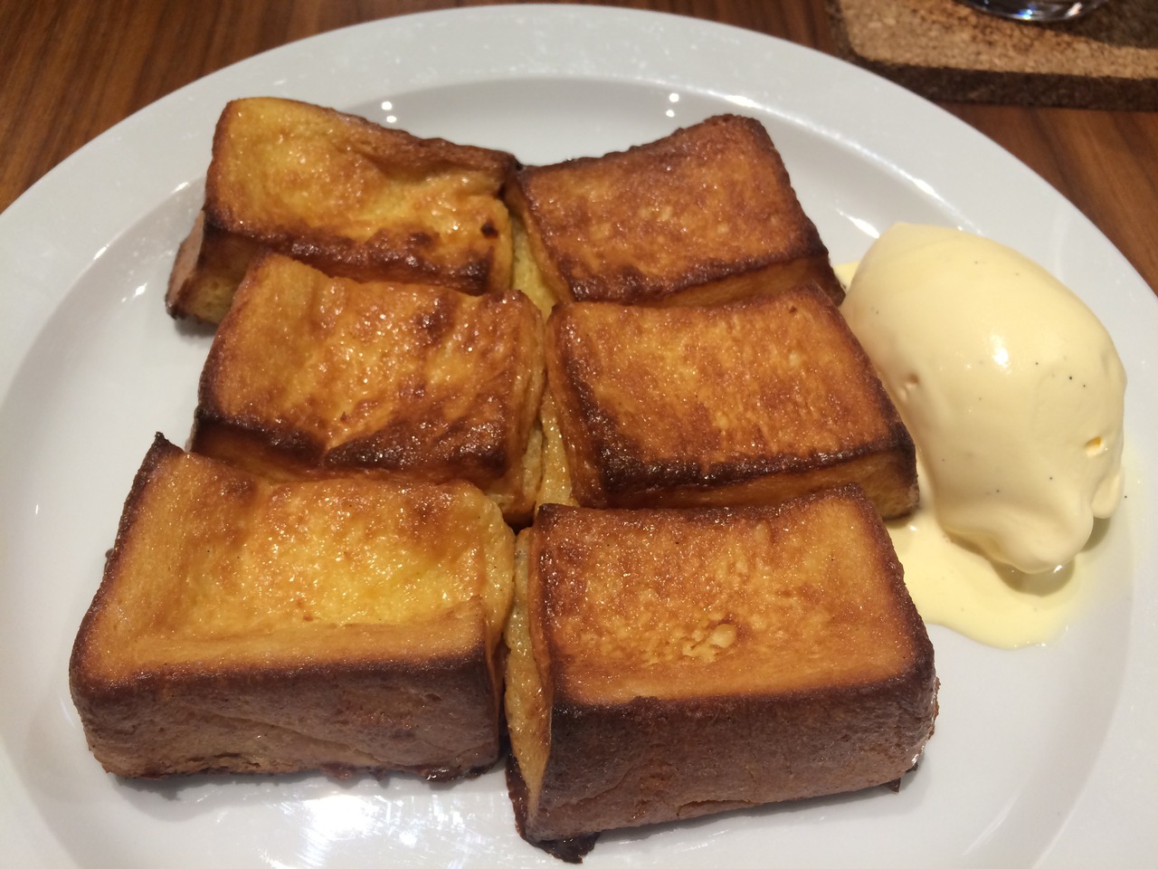 フレンチトーストを注文!少し待ち出てきたらとてもいい匂い!熱々でした!パンの耳の部分はカリカリで美味しい!ただちょっと1人だと量が多いかなー。