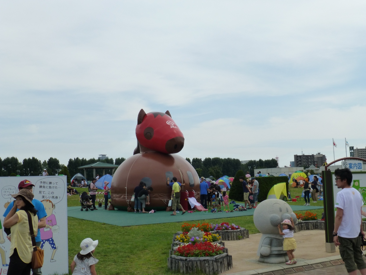 馬場内は 子どもの遊具もあり 家族連れで ピクニック気分で楽しんでいる人が大勢います。小型のテントを張っている人もいました。