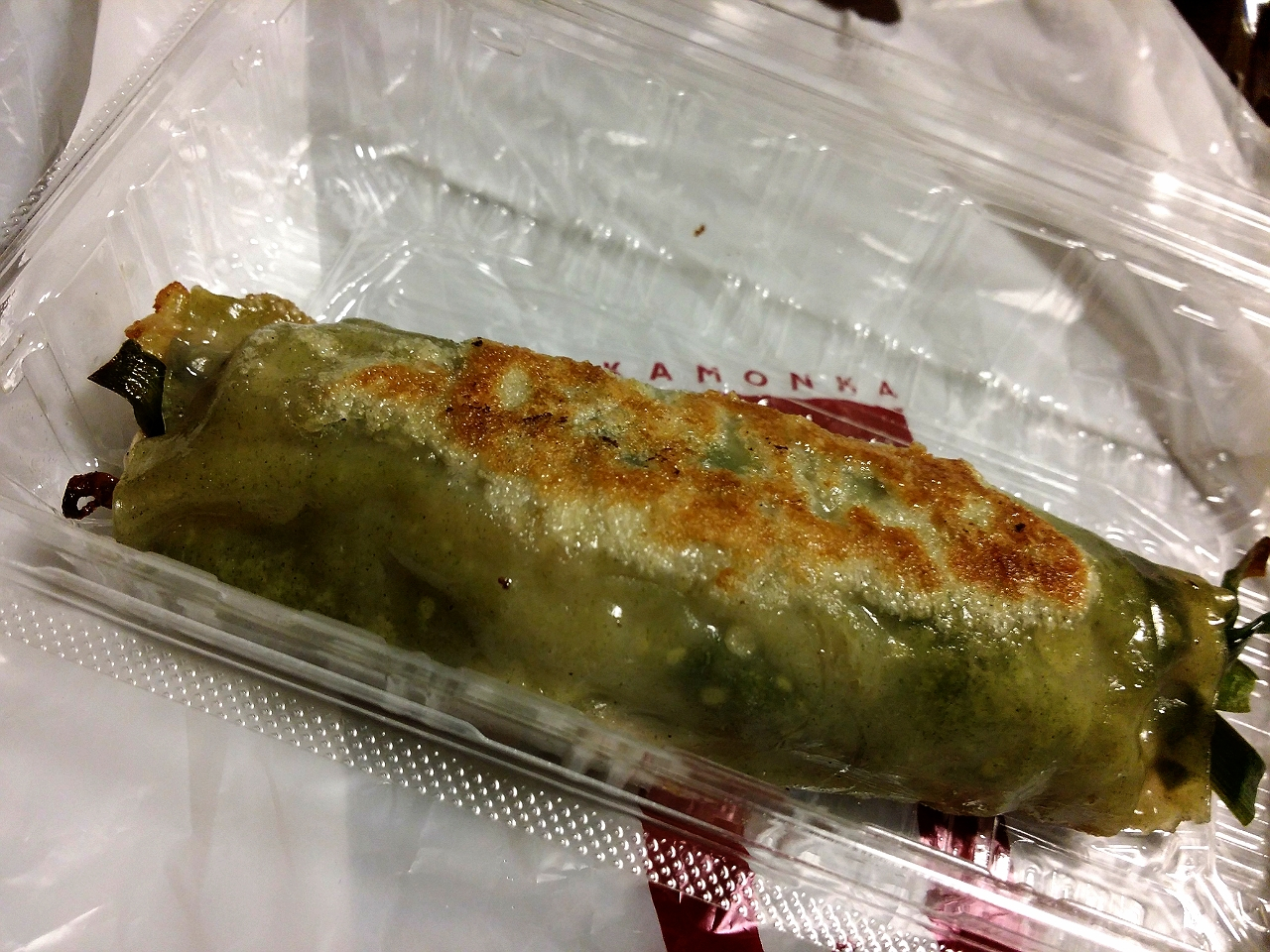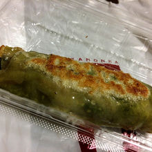 ほうれん草が練り込まれた生地で、ニラ、ニンジン、モヤシを巻いたもの。