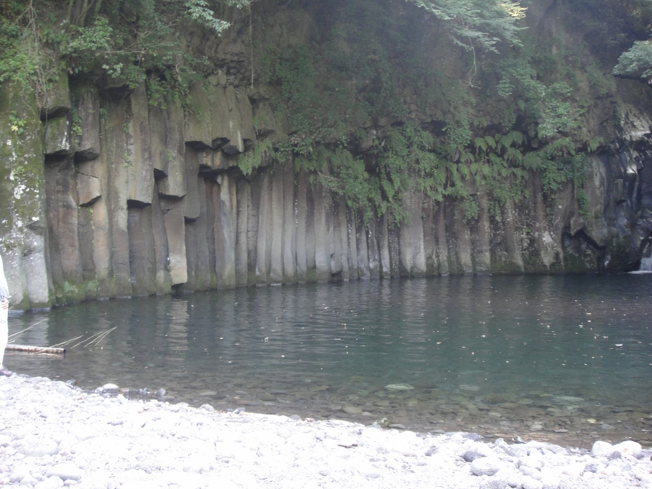 屏風岩はもともと溶岩が冷えたものに割れ目が入ってできたそうですが、その姿は名前の通り屏風のようです。あたりは滝壺のような空間になっていて、澄んだ水が青く神秘的に見えました。ただ河原の足場がとても悪いので、履物に気をつけるといいと思います。