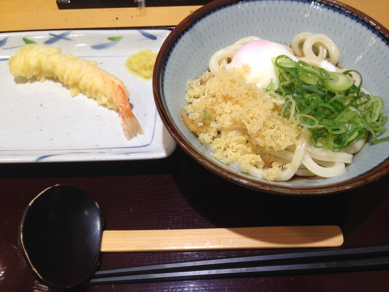 夜便だったので、軽く冷やかけうどんを。海老天を追加してみました。