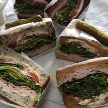 それぞれブレッドの種類が違い、フレッシュなお野菜がたっぷり挟まれ、ハムやターキーも他の具材を損なわない味付けです。大きくて、男性でも満腹になるのではないでしょうか。ピクルスも美味しかったです。