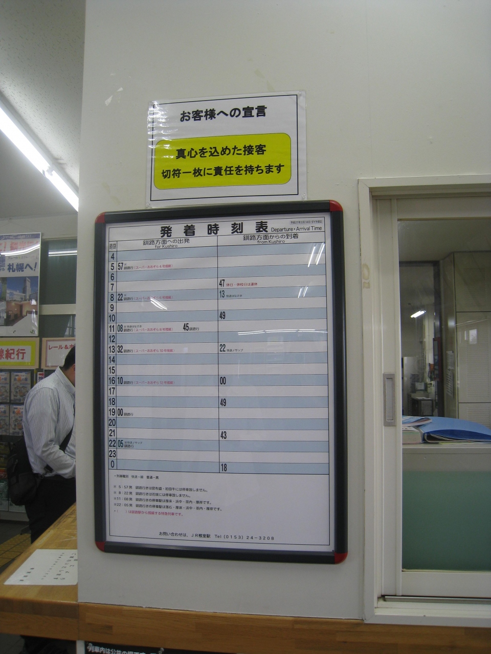 花咲線の終着駅で、その先に駅はありません。ホームは入れませんが、改札からのぞけました。鉄ちゃんではないので、全く知りませんでしたが最東端ではないようで、ひとつ前の東根室という駅が最東端とのことでした。駅前に駐車場がありますが、無料のため、電車を使用する人が長時間止めているようにも思えました。周囲にはバスターミナルに併設されているお土産屋さんや魚介系売店もあります。学校が休校の場合は何本か運休となる旨が時刻表に正式に記載されていて驚きました。