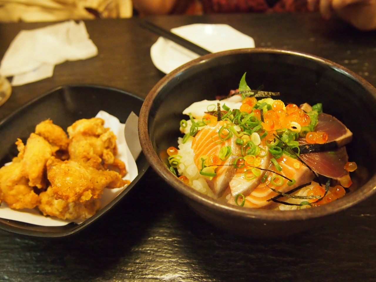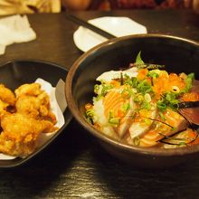 お魚がメインの居酒屋で店内は狭く、料理のPOPがずらーっと貼ってあります。