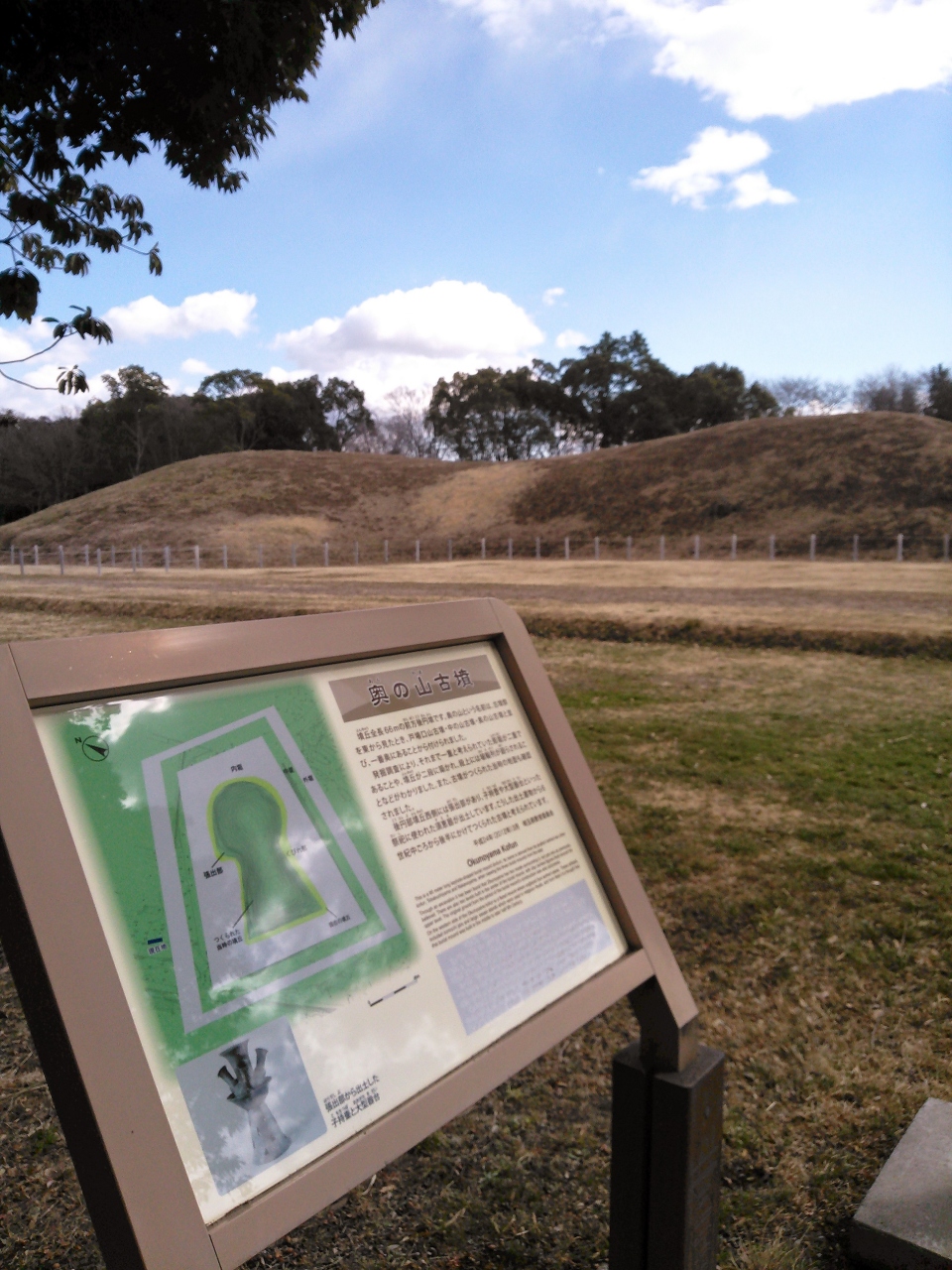 行田市にあるさきたま史跡の博物館の敷地の奥にある古墳です。前方後円墳ですが、わりとこじんまりしています。発掘調査が行われ、整備されたのがつい最近らしいです。公園内の古墳は登れるものもありますが、これは登ることができません。