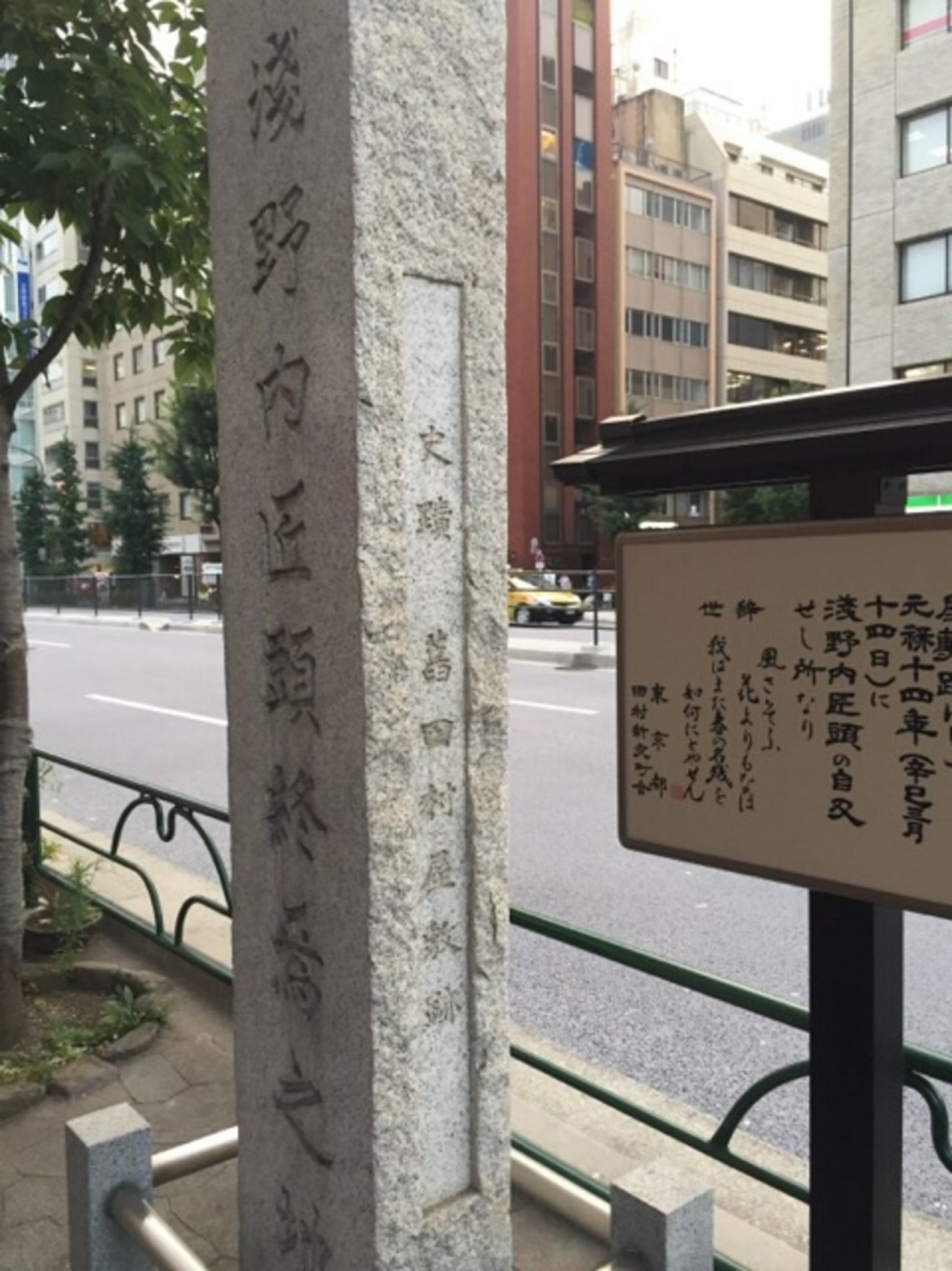 江戸時代にはこの辺りは奥州一之関藩の田村右京太夫の上屋敷がありましたかま、浅野内匠頭は江戸城松の廊下での刃傷沙汰があったその日のうちに、この屋敷で切腹させられた場所だそうです…