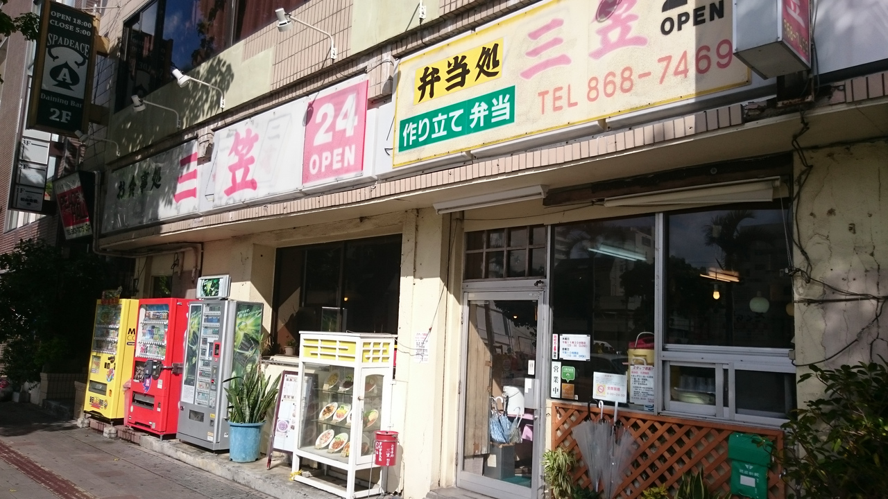 那覇市内の松山にある沖縄の定食が食べられる24時間営業のお店。こちらも沖縄食堂のみかどの並びにあります。すきやき、ちゃんぷる、ポークたまこ、ちゃんぽん、味噌汁、沖縄そばなど、沖縄ではメジャーな定食に加え、トンカツ、カツカレー、カツ丼など、沖縄の人が大好きなメニューが揃っています。なかでも三笠風のちゃんぽんは、ひき肉と玉ねぎが中心の具材をカツ丼と同じたれで卵て閉じてあり他のお店とはひと味違います。と店にはいるといきなり厨房というスタイルは変わらず。季節料理で、ゴーヤちゃんぷる、へちまの煮込み、からしな炒めもある。24時間営業ですが、木曜日の深夜は営業していません。