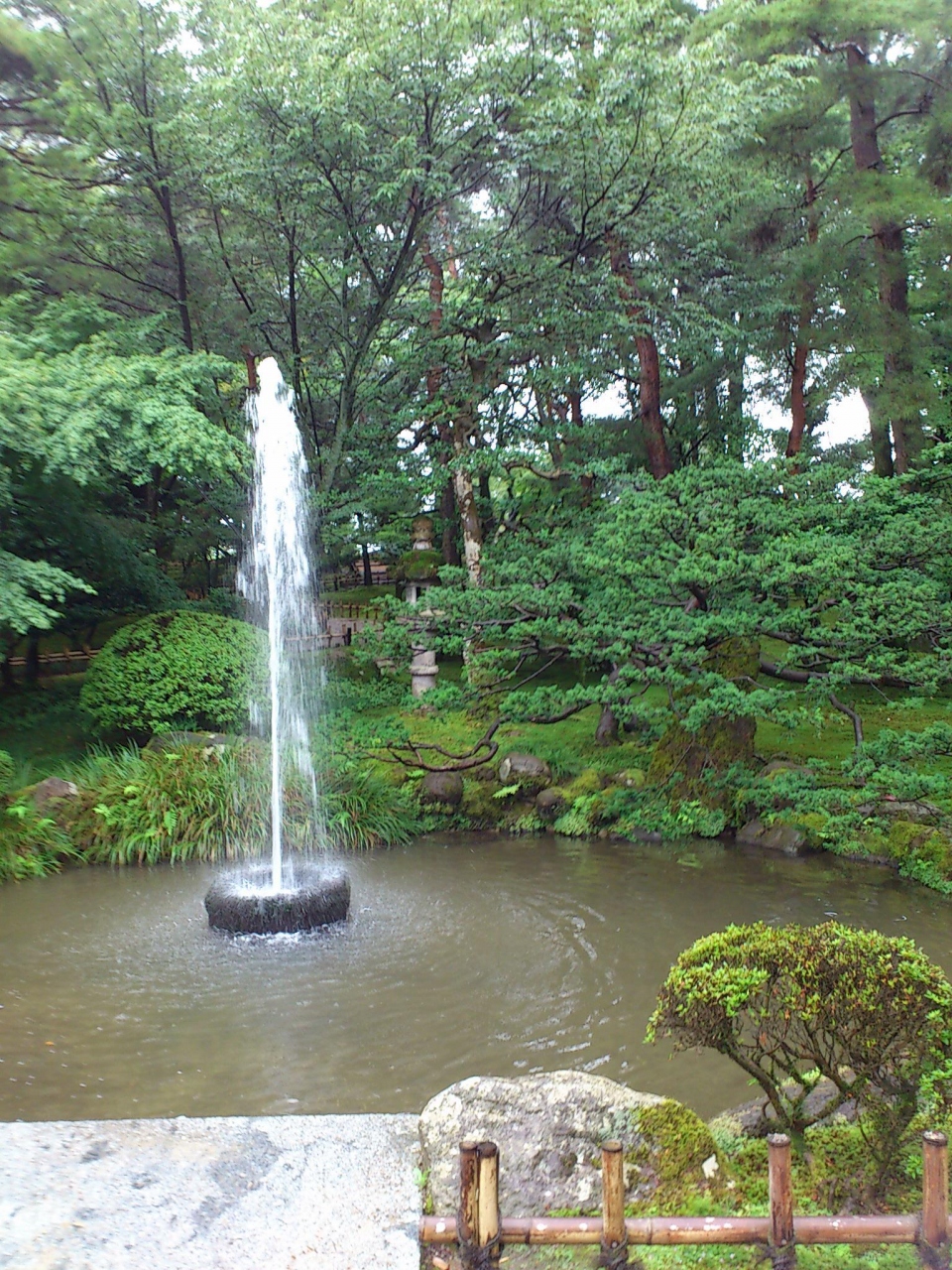 兼六園の霞が池を反時計回り方向に観光して、最後の方に出会った噴水です。日本庭園の中に噴水とは不似合いと思ったのですが、これが日本最古の噴水だそうです。それもポンプ等の力ではなく、霞が池との高低差を利用して自噴しているそうです。昔の人の知恵には頭が下がります。