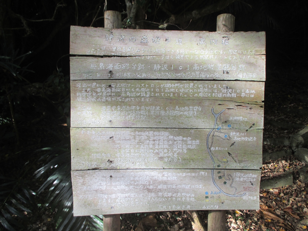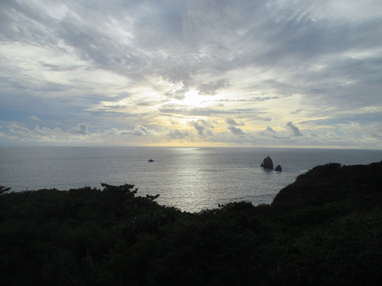 ははじま丸の船内に母島の観光スポット3位と書いてあったため、行く前から楽しみだった。鮫ヶ崎展望台の後、道路をまっすぐ行く。行きは登りのため行くまで時間がかかったが、帰りは下りのためスムーズに下ってきた。静沢の森遊歩道の案内標識がある辺りに戦跡があったため、始めに立ち寄ってから案内通り曲がった。たまに道がそれるため最終目的地までは行かず道路沿いを通って戻ってきた。曇っていたが、帰りに何となく夕日が見れよかった。