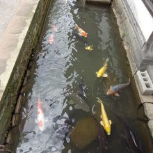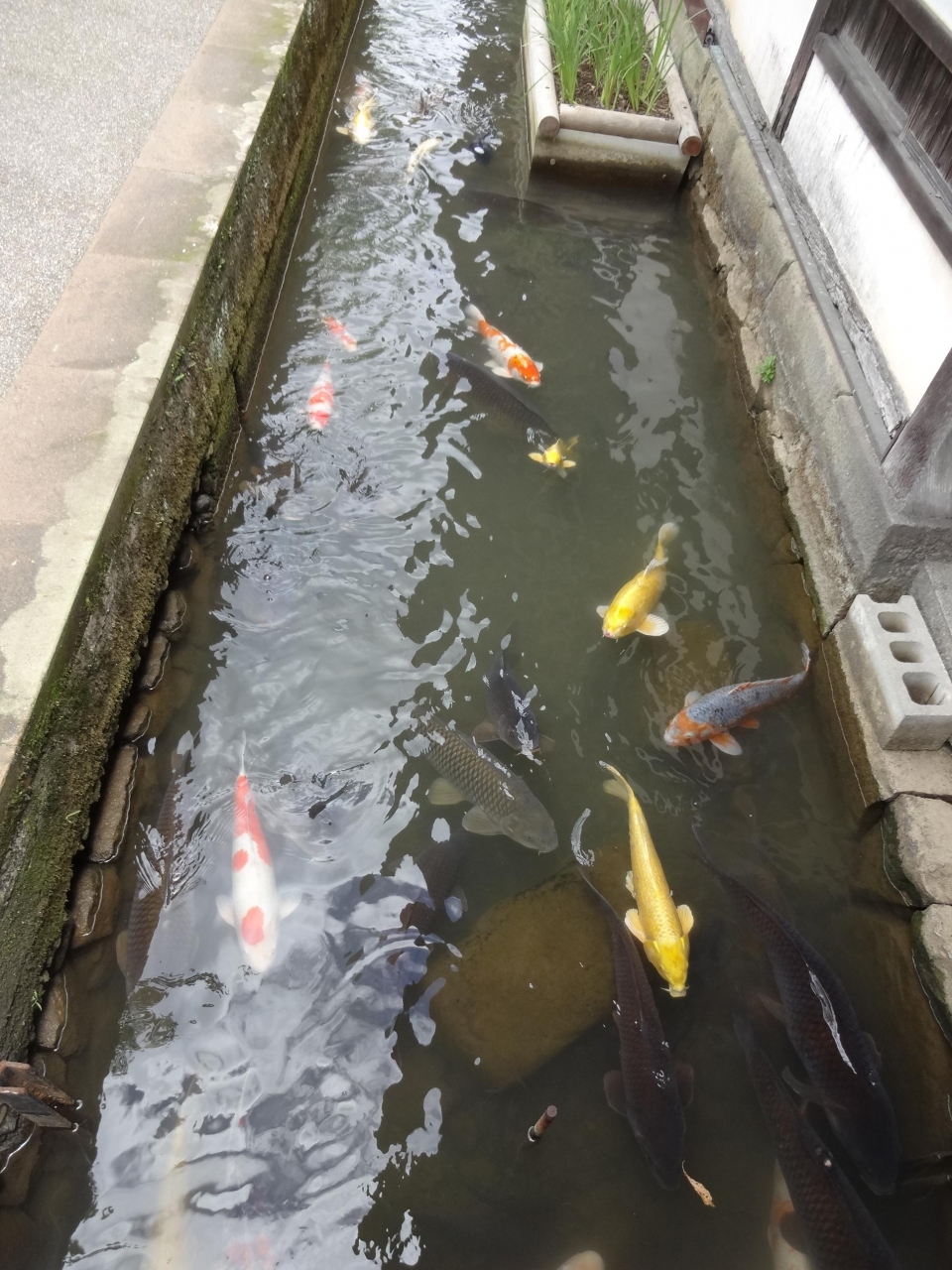 町並みに加え印象的なのは、塀に沿って流れる堀と、そこに泳ぐたくさんの鯉です。千匹以上いるといわれています。数もすごいですが、大きい鯉が多いので圧倒されそうになります。