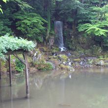 兼六園の奥の方にある瓢箪の形をした瓢池にある滝です。雨の日だったこともあり、観光客は霞が池のまわりの有名どころに集中して、このあたりにはほとんどいませんでした。霞が池から落ちる水を滝の形にしています。落差は約6mです。霞が池からの水なので結構な水量になります。