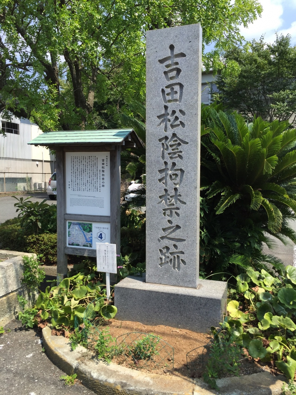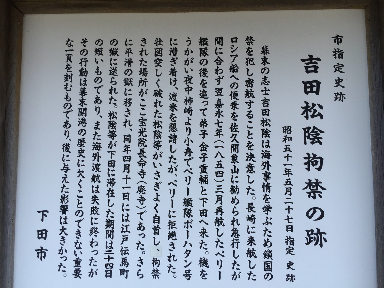 現在の下田市公民館の前に碑があります。当時は長命寺で、吉田松陰らがハリスに頼み込み密航しようとしたが、失敗に終わったため、自首をして、拘禁されたのが、この寺でした。時代を動かす人の行動力と潔さは目を見張るものがあります。