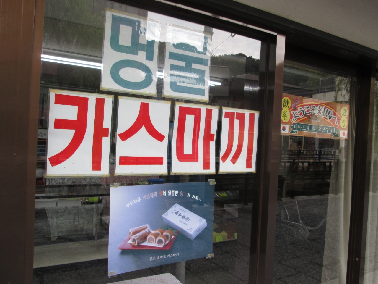 厳原の街中にある対馬名物かすまきのお店です。店頭にはハングルの文字があったり、韓国のお客様も多いのかなと思います。ここのかすまきは、空港等で売っているような脱酸素剤が入っているパックでないようで日持ちがしません。