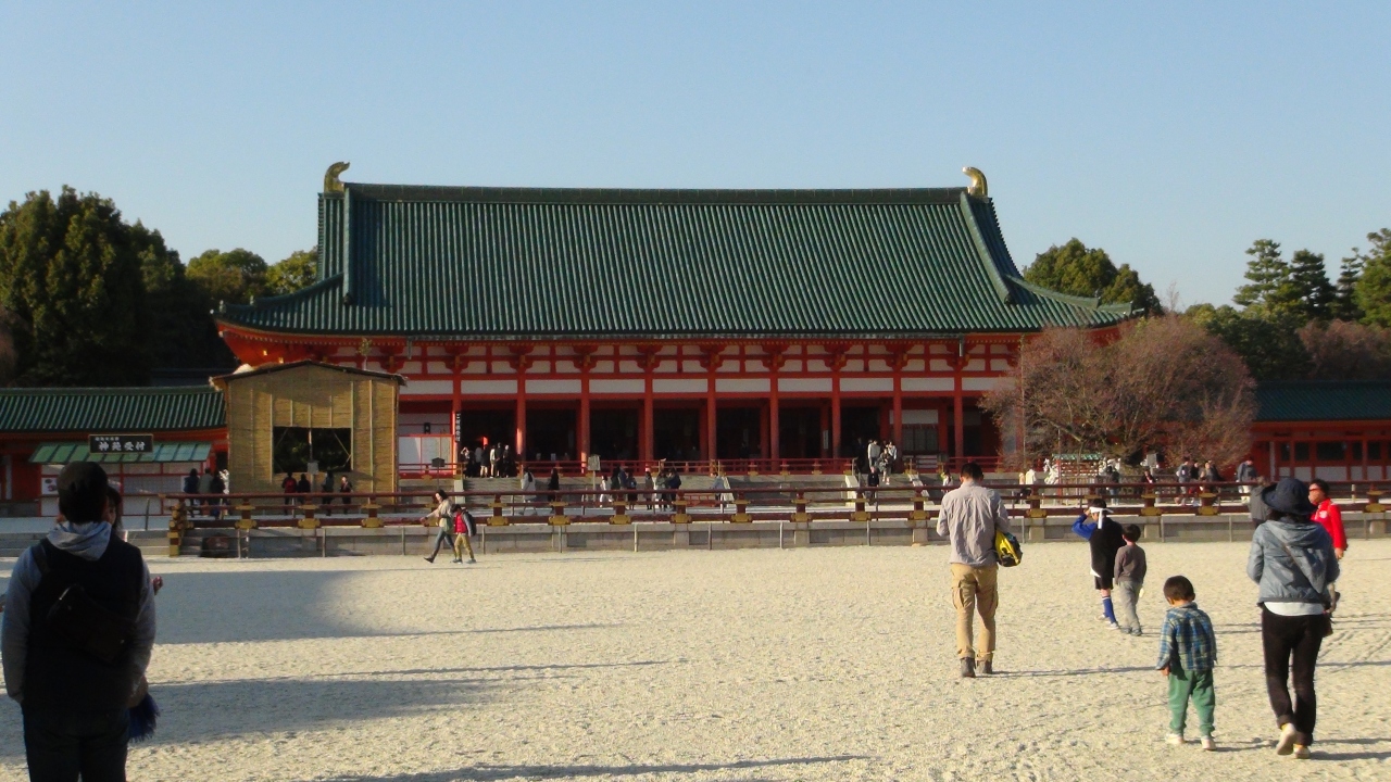 日本有数の大きさを誇る大鳥居は、柱も極太く、風格があります。実は平安遷都1100年を記念して、明治28年に創建された比較的歴史の浅い神宮ですが、広々とした境内と巨大な太極殿や応天門は荘厳さを醸し出しています。