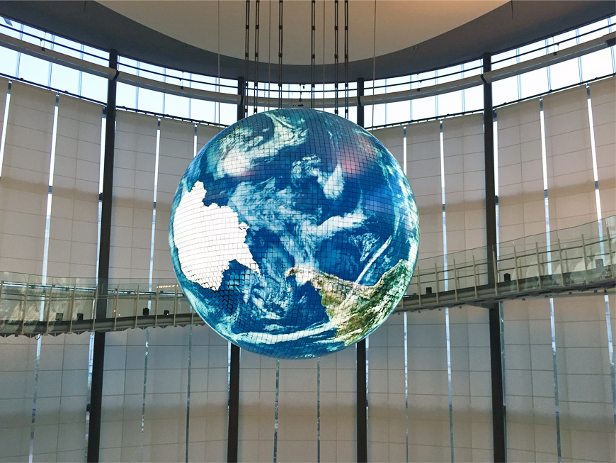 球体ディスプレイ「ジオ・コスモス」も綺麗で、シンボルゾーンでは寝ころびながら見ることができます。