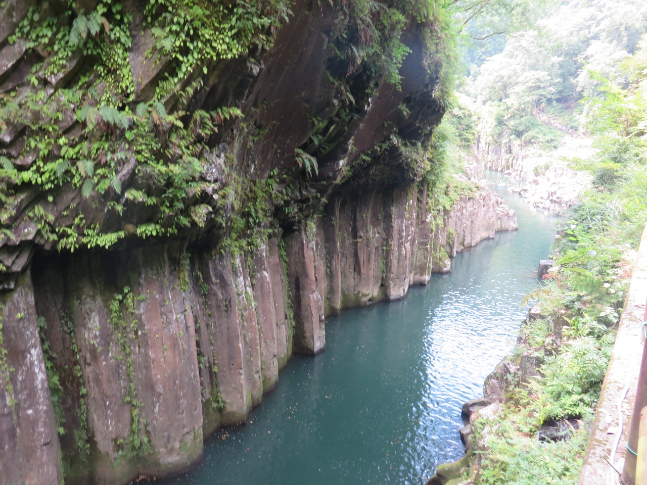 高千穂峡の遊歩道の対岸にそびえる屏風面の岩は、