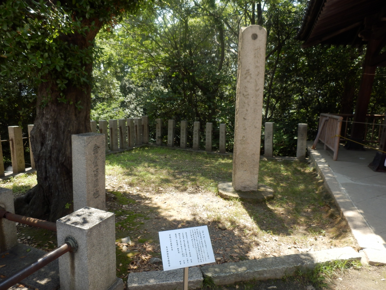 大江神社の境内に俳句が刻まれた石碑があります、4つの句はつぎのとおりです、?あかあかと 日はつれなくも 秋の風 ?よる夜中 見ても桜は 起きて居る 松井三津人 ?綱の子の 名にやあるらん 杜宇 千季 ?春風の 夜は嵐に 敷れ鳧 加藤暁臺、それそれの歌人どうしがどんな関連があるのかは分からないです、