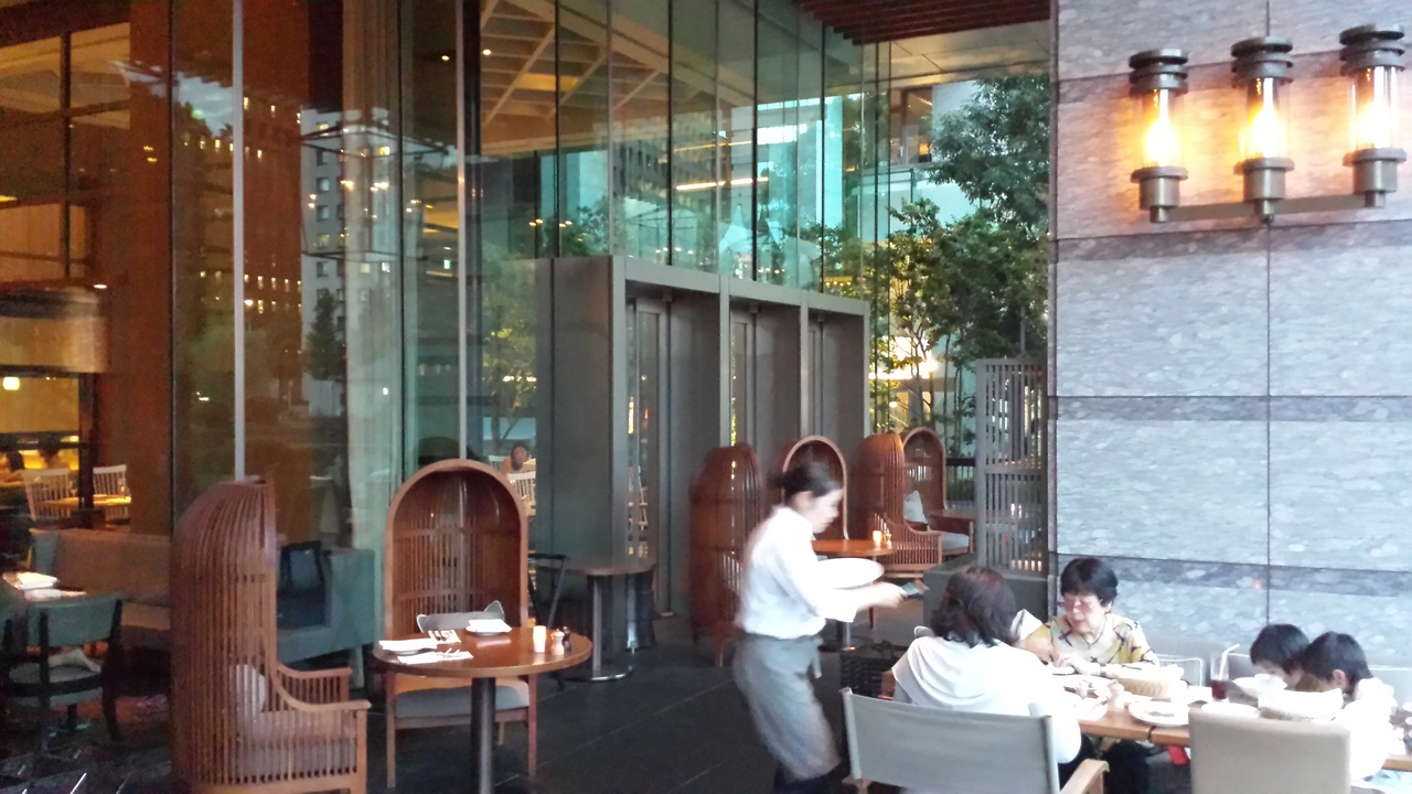 パレスホテル1階にあるレストラン。屋内テーブルもありますが、今回はテラス席を利用しました。テラス席は皇居のお堀に面していて、雰囲気良かったです。夜も酷暑でしたが、扇風機もあり、心地よかったです。ホテルレストランなので、テーブルやスペースも広々、スタッフもしっかりしていました。ワインボトルが3,400円~あり、店の格の割に、リーズナブルでした。