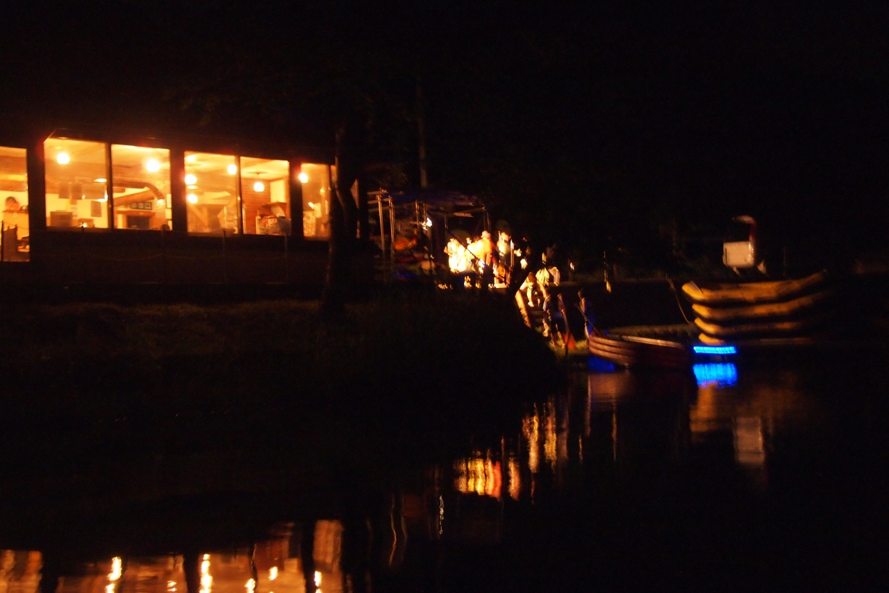 ホテルまで迎えに来てくれ、真っ暗な湖に到着。各々ライフジャケットを着てボートに乗り込みます。
