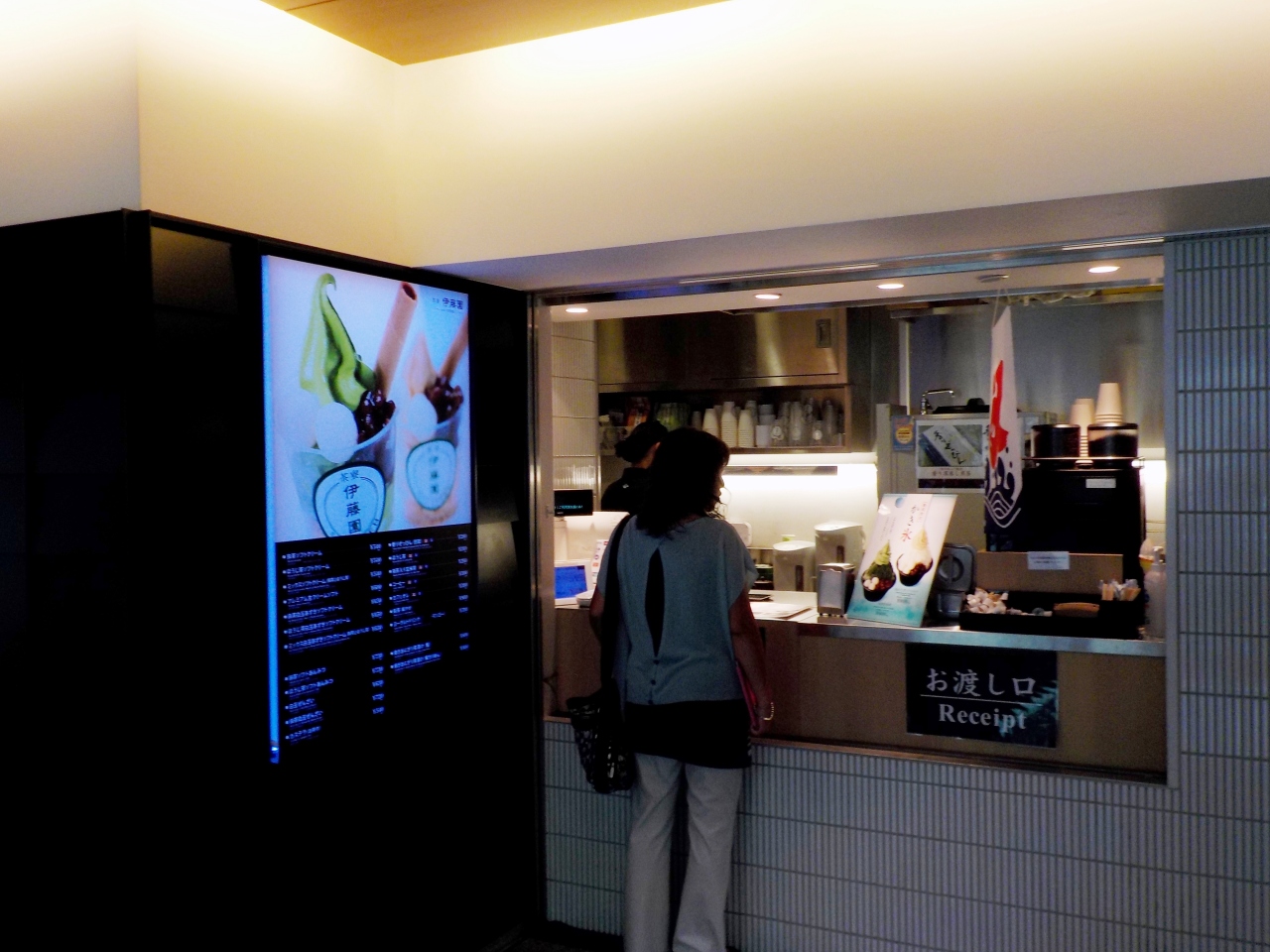 各航空会社のチェックインカウンターを見下ろせる中二階に、伊藤園が展開させている茶房があったので利用してみた。一般的な甘味処のメニューに多いのは抹茶系のスィーツだが、この時は期間限定で、焙じ茶アイスのパフェがあったので、それを妻が選んだ。