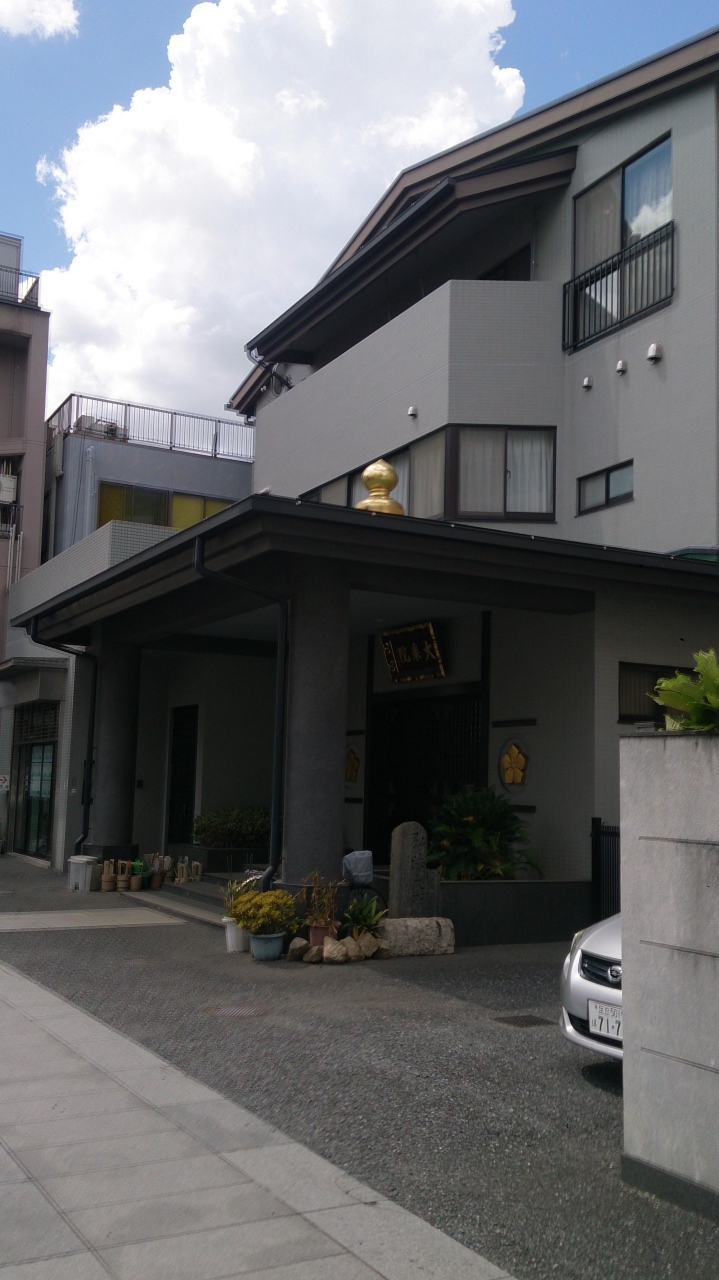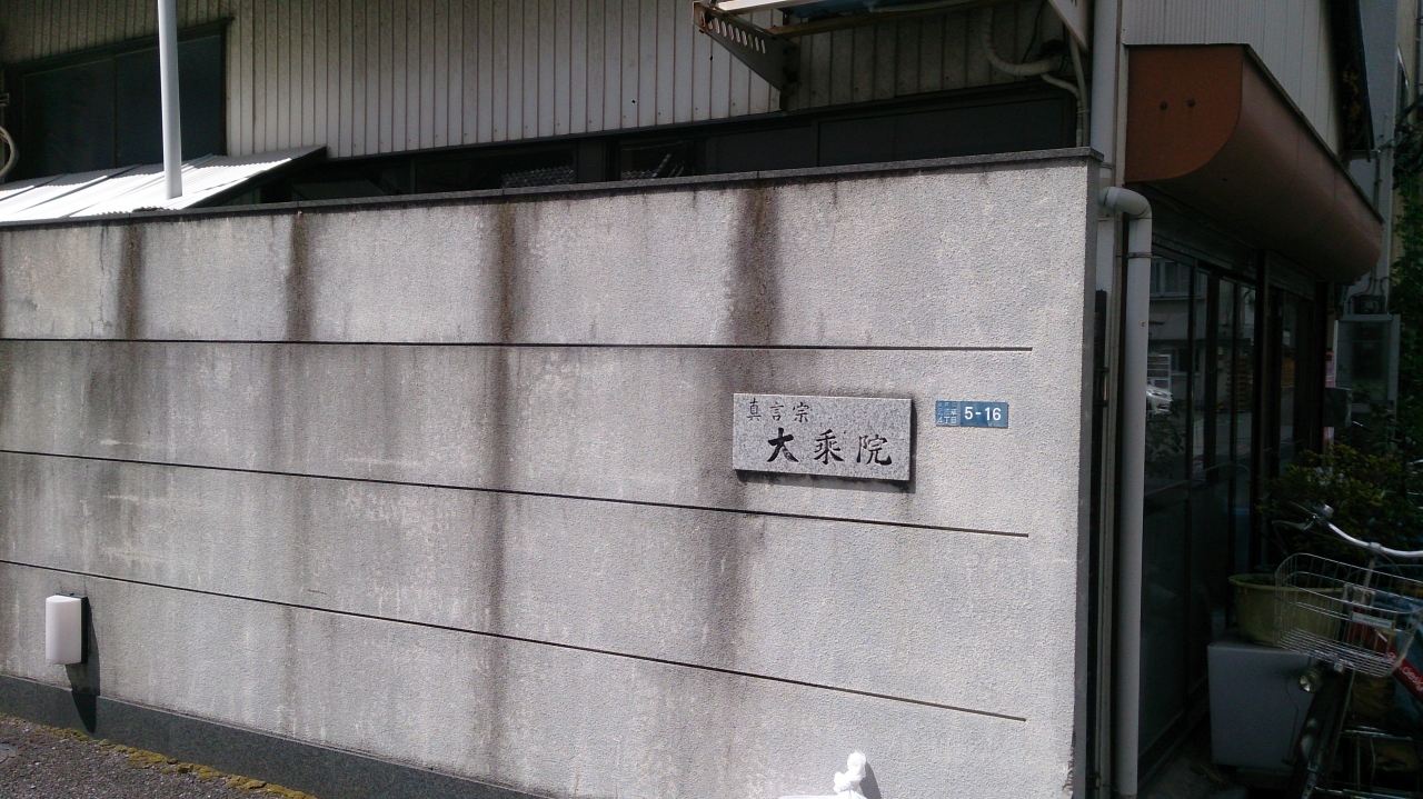 こちらは都会らしい寺院で山門らしきもは見当たらず、コンクリート壁に御影石の表札がはめ込まれており、その表札は少し大きめで大乗院と彫られていますが個人の表札の少し大きいバージョンという感じです。本堂は遠目に見ると普通の戸建住宅の外観で、近寄って見ると玄関の上に寺名が金文字で記された額縁が掲げられており、さらに玄関の屋根の上に金の飾りがあってお寺と認識できます。ここを主目的に訪問するかどうかとなると微妙です。