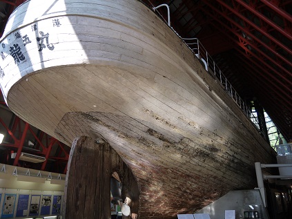 この展示館は無料です。昭和29年3月マーシャル諸島に有るビキニ環礁で行われた水爆実験により被害を受けたマグロ漁船「第五福竜丸」を展示しています。被爆後は練習船に改造され東京水産大学で使用されてましたが昭和42年に廃船、遠洋漁業の実態と原爆の被害を繰り返さないとの思いを込め昭和51年に展示館を開館しました。