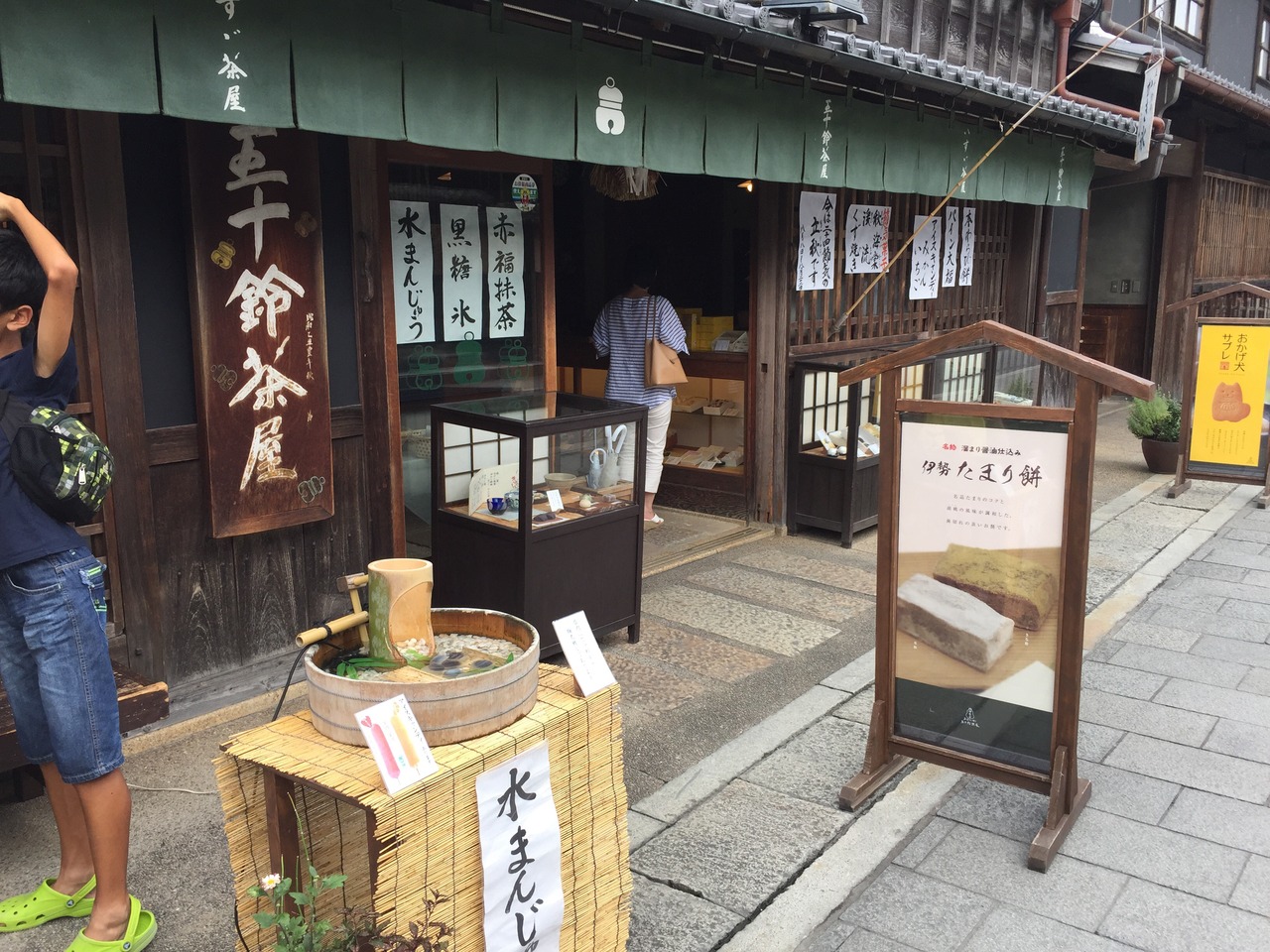 内宮への参道に面して建っています。店舗の入口には水の流れるオブジェと水饅頭が置いてあり、涼しげな雰囲気を醸し出していました。お菓子は水饅頭や醤油を使った溜まり餅があり、どちらも柔らかな味で美味しかったです。