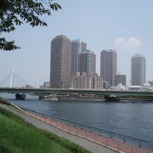 東京メトロ築地駅から市場で食事して勝鬨橋から隅田川テラスを歩いていくと聖路加タワーの脇から緑色の佃大橋が高層ビルをバックに映えます。佃大橋は東京オリンピックの時建設されたそうで佃大橋が架橋されるまでは渡し舟が通っていたそうです。橋下を隅田川クルーズ船が通過するのを眺めるのも気持ち良いです。