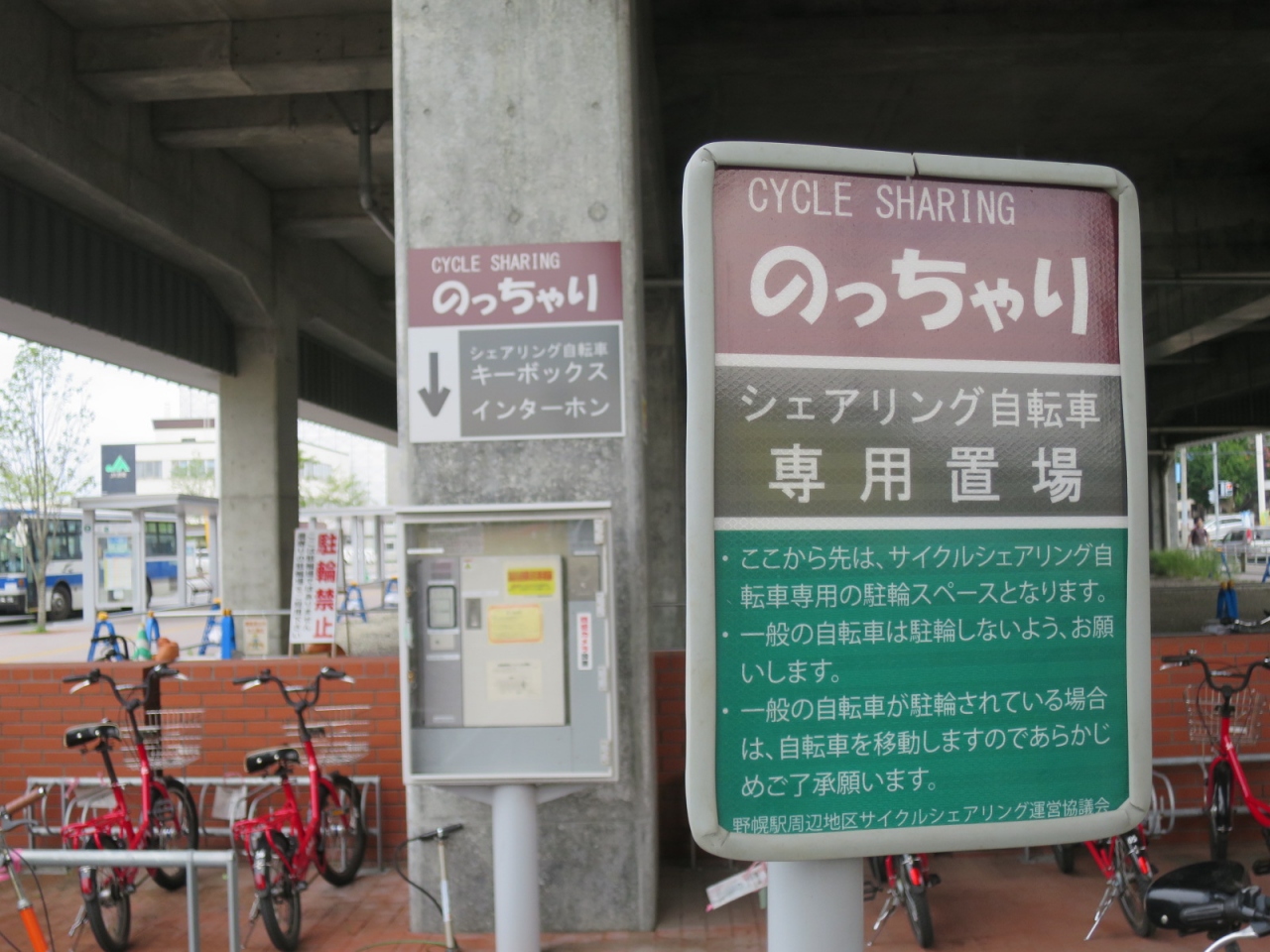 駅西側自転車置き場に「のっちゃり」というシェア用自転車が置かれていますが、野幌駅周辺に住む人や北海道情報大学の人をターゲットにしていて、期初の2~3月に事前申込してシーズンで利用するため、旅行者などは使えません。