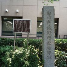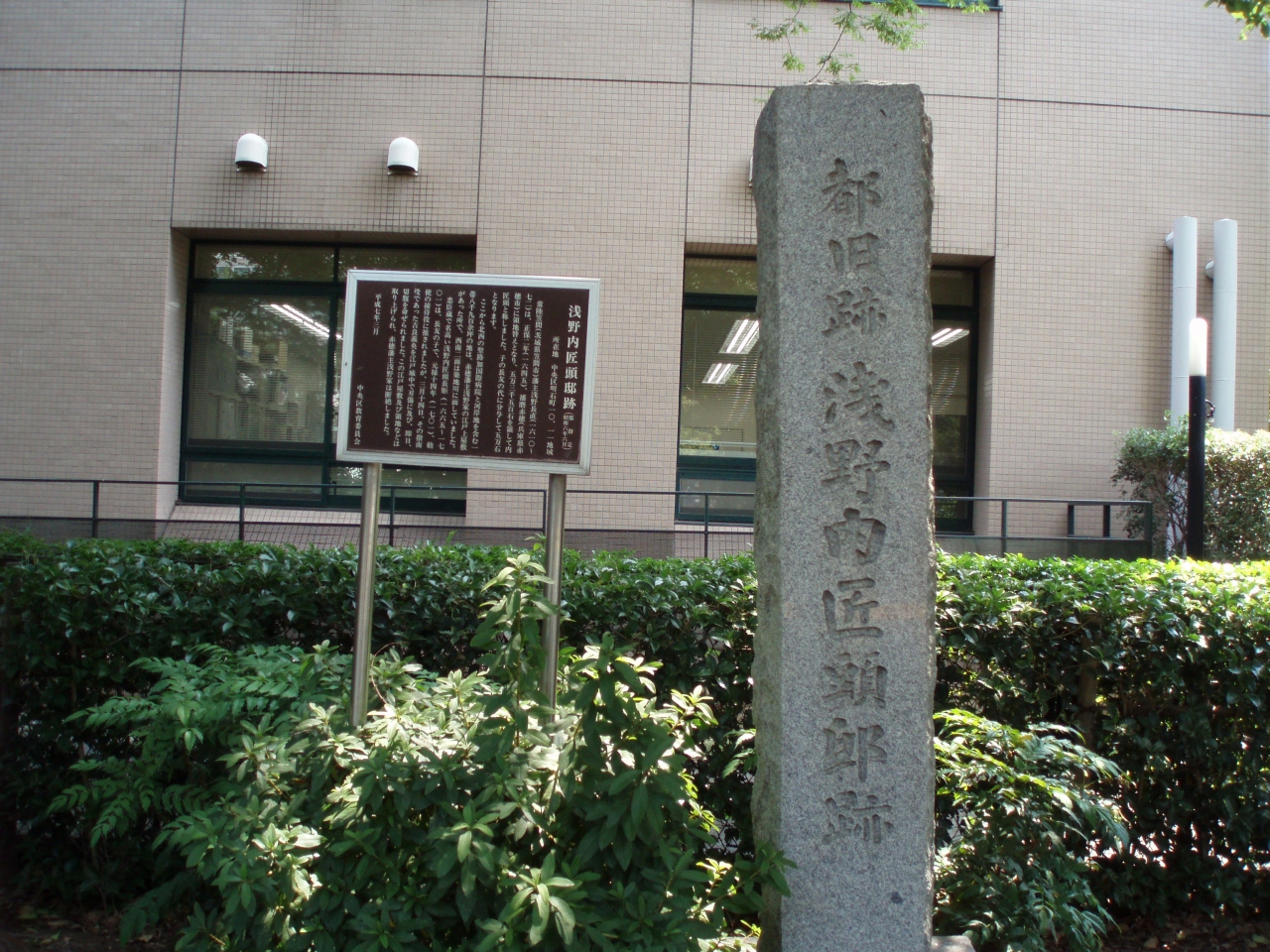 東京メトロ日比谷線築地駅から聖路加タワー方面向かう途中の築地川公園過ぎ聖路加国際大入口の左側脇の歩道植え込みに浅野内匠頭邸跡案内板と石柱に歩いて5分ぐらいで着きます。江戸時代、浅野家江戸上屋敷地として8900坪あったが吉良刃傷事件でこの地を取り上げられ断絶されたそうです。忠臣蔵でお馴染みですね~
