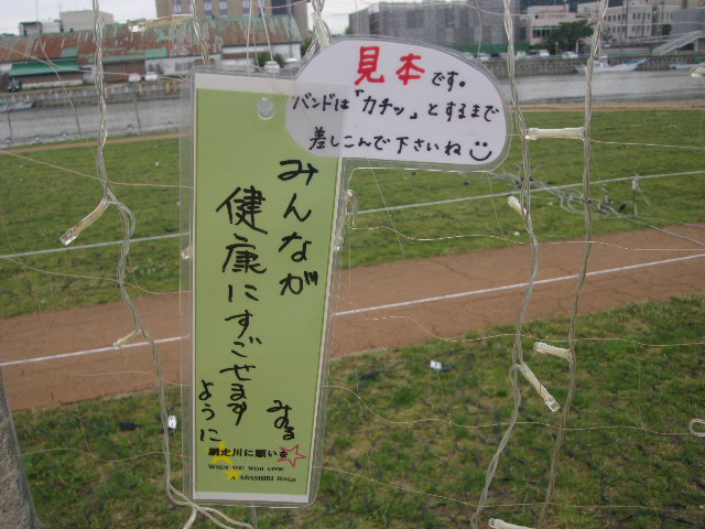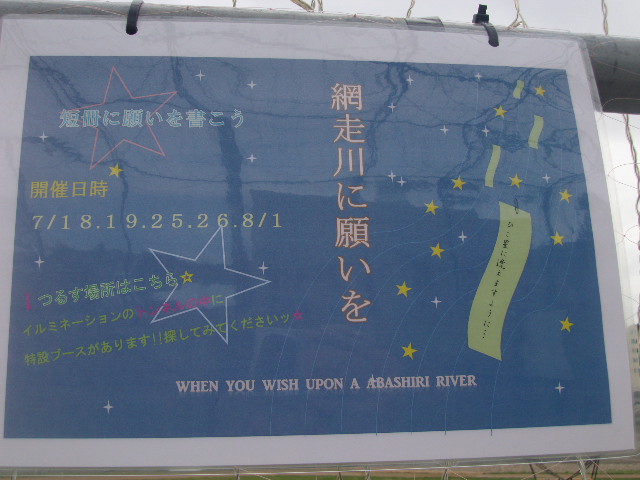 私はこのイルミネーション開催時期に網走川を散策しましたが、前夜に開催を知らずに、点灯された姿を見ることはできませんでしたが、代わりに会場の昼間の姿を確認することができました。電飾のオブジェの脇には七夕用のお願い事を記す紙が用意されていて、自由にそれを電飾オブジェの所定の位置に吊るすことができるようになっていました。夜なら気づかなかった可能性もありますので、是非、昼夜を合わせて訪問されることをお勧め致します。