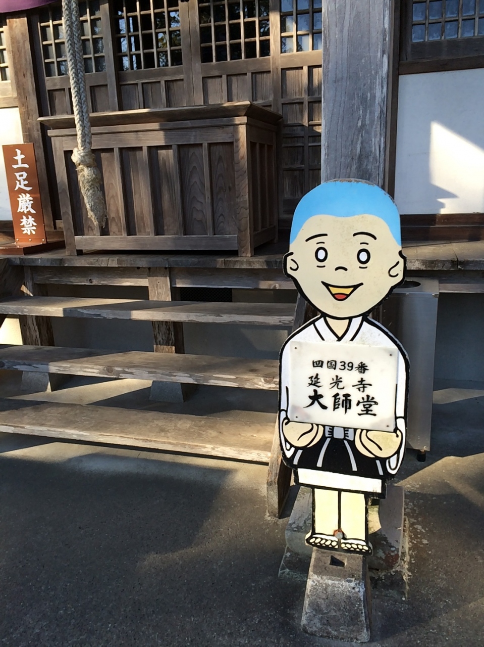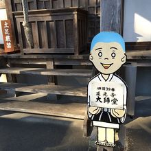 本堂から納経所の間に目洗い井戸があり目の悪い人には良いようです。境内はこじんまりしていて木が周りを囲んで、ジャリが結構しき詰められて綺麗に掃除されていました。大師堂前にある小坊主の看板が愛らしいです。
