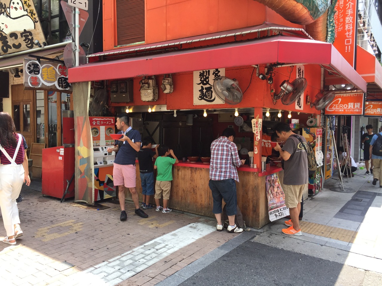 地下鉄のなんば駅の14番出口に近付くだけで匂ってくるとんこつ臭ですが、実際の味は匂いほどキツくありません。ちょっと拍子抜けしてしまうレベルです。全て立ち食いな上にラーメンの器が脂ぎっていたりと屋台環境に慣れていない人は無理だと思いました。
