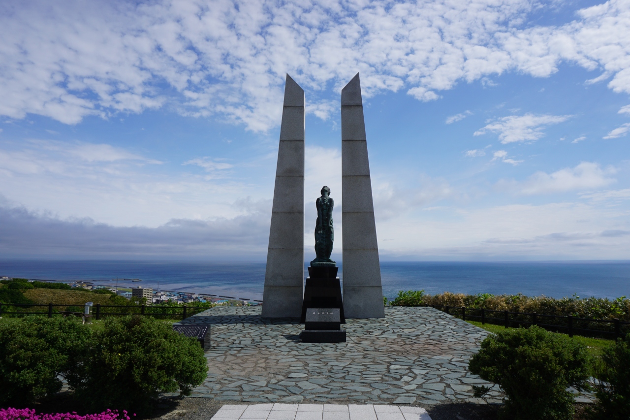 氷雪の門は、樺太から引き揚げてきた人たちの望郷の念を表現したモニュメント。以前、北海道庁旧本庁舎の展示室で、北方領土の問題もあるけれど、樺太の問題も忘れてはならないということを知りました。稚内はその樺太との中継基地の役割も担っていた街だったんですが、高さ2.4mの女性像の異様に大きな手が心のうちを表現しているのだそうです。