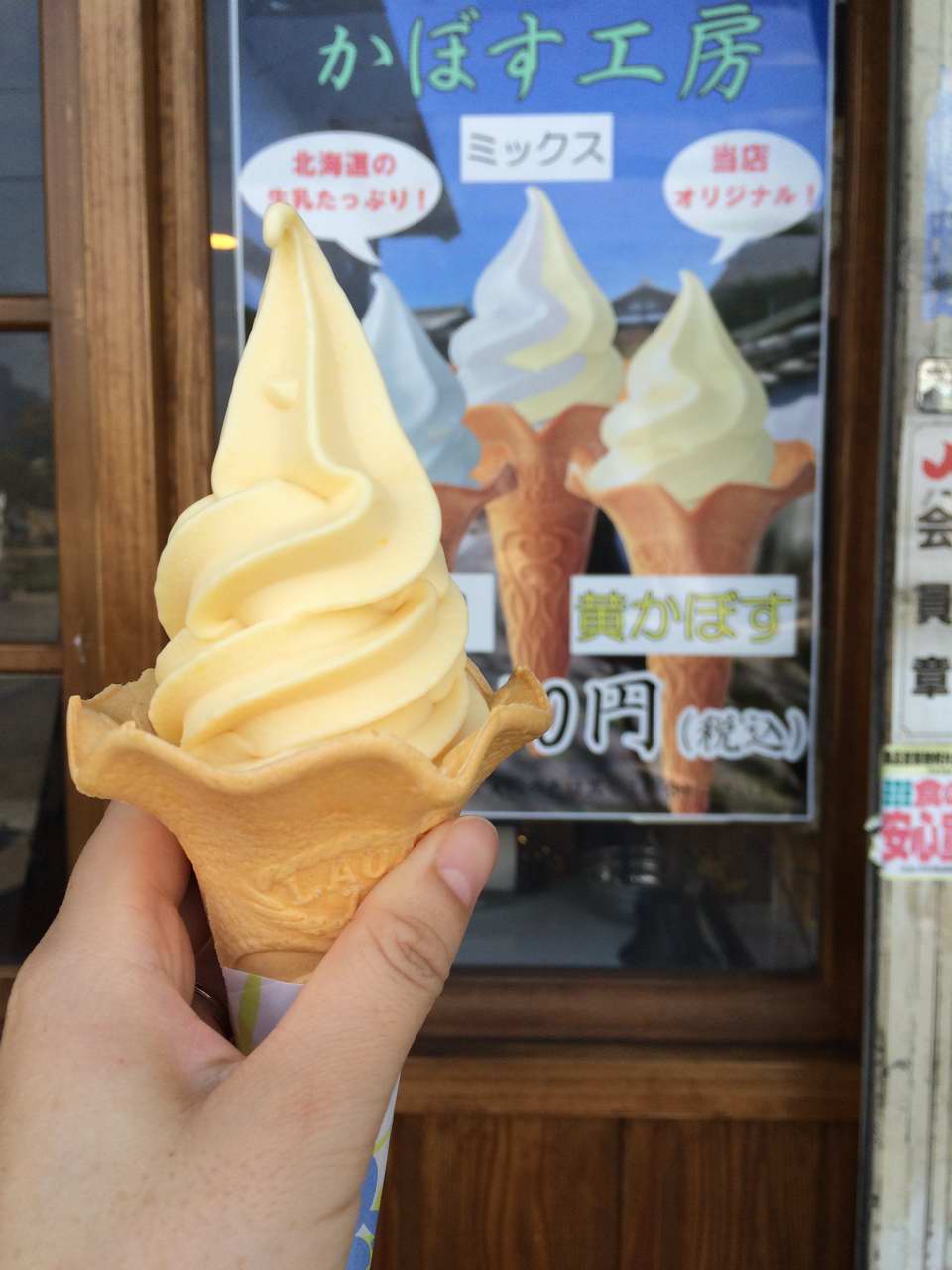 テイクアウトで黄かぼすのソフトクリームがあったので購入。