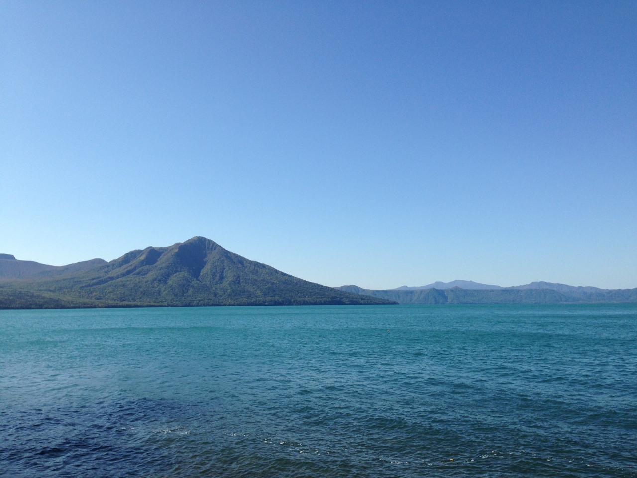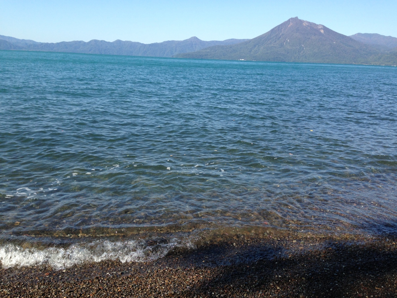 支笏湖畔で宿泊し朝に窓から支笏湖を見てみると真っ青。天気も良かったので湖面近くまで散歩に行きました。近付いてみると風が少し出ていたので波になっており海のようでした。水はとても澄んでいて本当に綺麗でした。最高の景観だと思います。