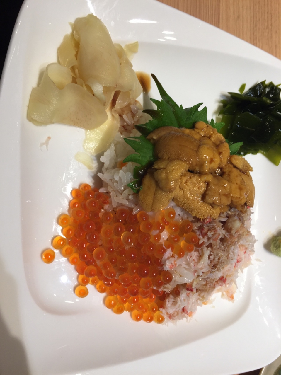 東京ミッドタウンで夜ごはん。地下のフードコーナーにあるこちらで、海鮮をイートインで頂きました。通路に面した席なので落ち着いて食べることはできないですが、わりと席数は多いです。頼んだのは、ウニ、イクラ、カニの三色丼。ウニが甘くてとても美味しかったです。函館にあるお店らしく、函館の海鮮を新鮮に頂くことができて良かったです。握りもありました。