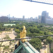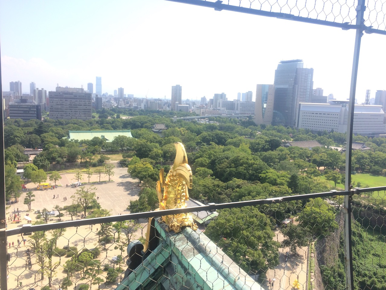 大阪城の天守閣にのぼって大阪観光です。久しぶりに展望台へのぼりましたが、国際色豊かで大混雑。しかも城内はクーラーがあまりきいてなくて暑い。蒸し風呂状態です。でも展望台にはいい風が吹いていて気持ちいい。景色もいい。