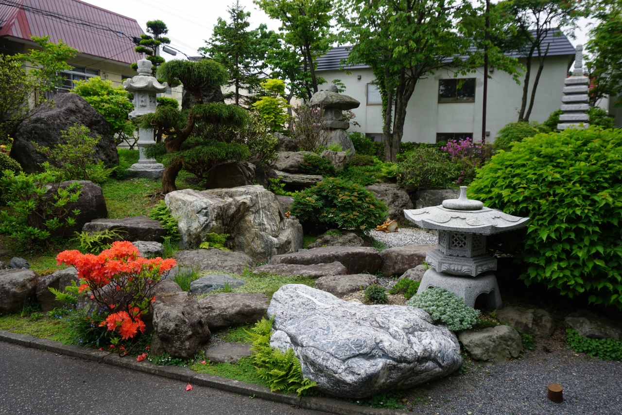 法雲寺は、稚内市街にある浄土真宗の寺。浄土真宗の寺はいかめしい構えの寺が多いのですが、ここは、境内に入ると一角に美しく整備された日本庭園があって、ちょっとした公園のよう。お寺の奥さんでしょうか。一生懸命庭の手入れをされていました。