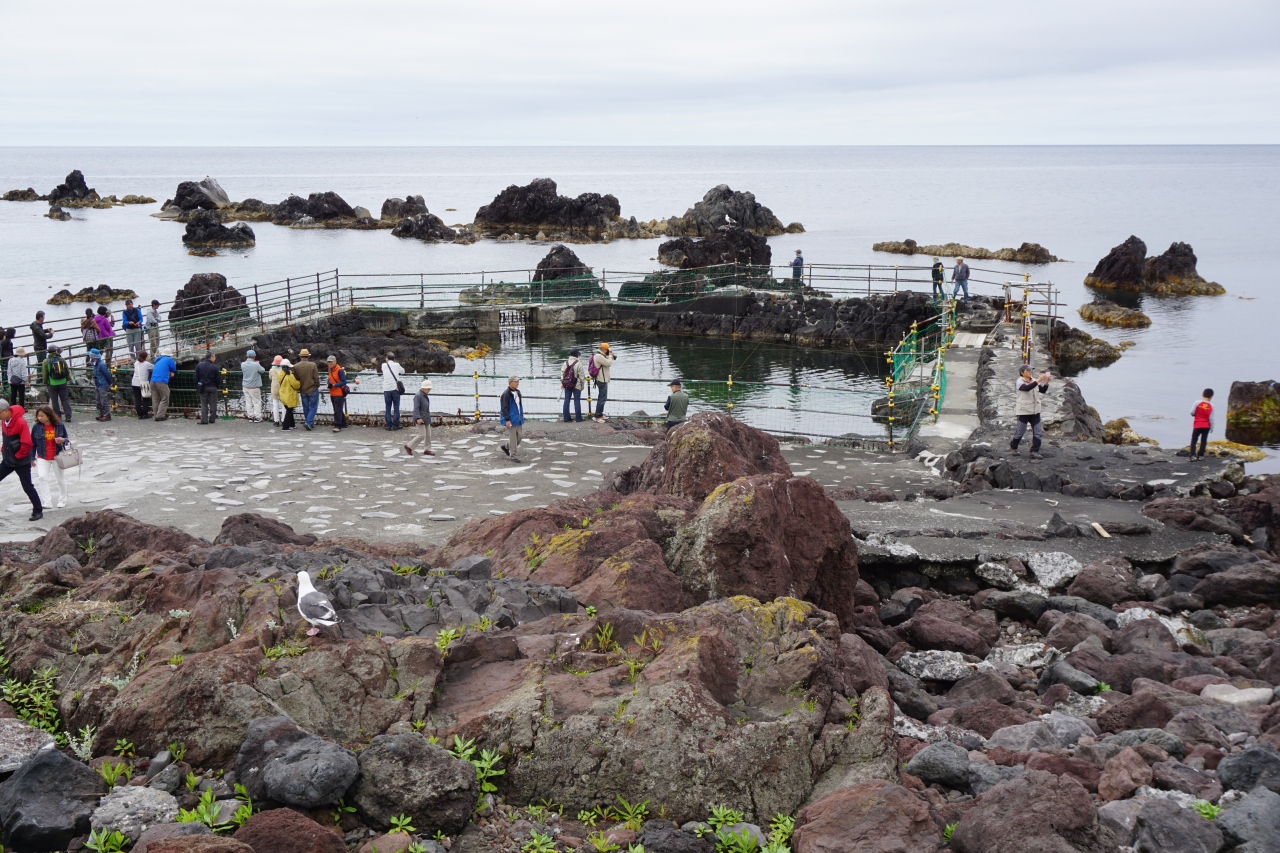 仙法志御崎海岸公園は、仙法志ポン山から流出したという溶岩流の跡が一帯に残る荒々しい磯場が特徴。黒い奇岩があちこちにあって、たぶんそれと利尻富士の対比が見どころなんでしょうね。この日はあいにくのくもり空。小さな水たまりにごまアザラシが飼ってあって、それを眺めたりして終わりでした。
