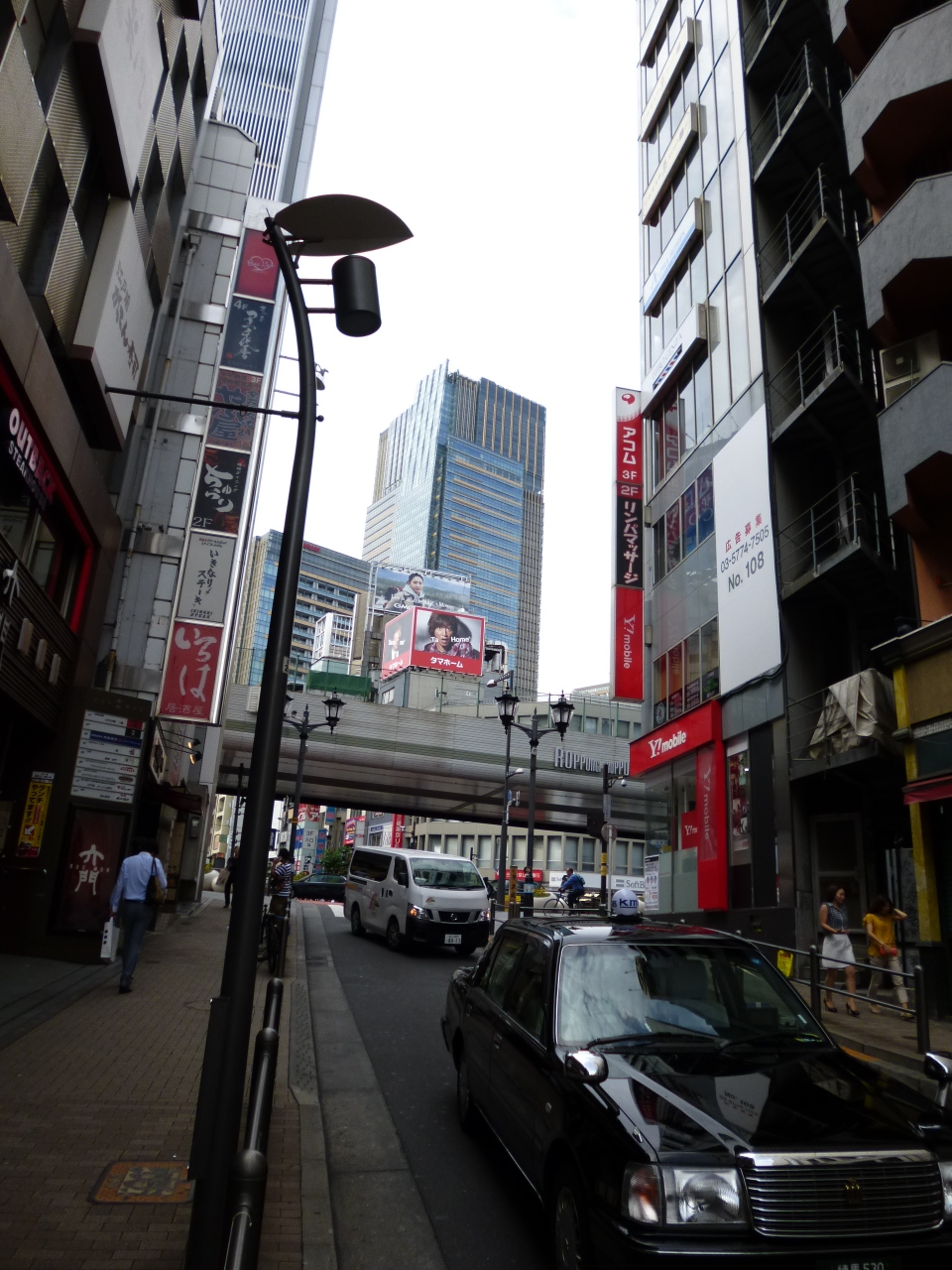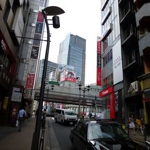 芋洗坂を坂下から見上げると、六本木交差点の向こうに東京ミッドタウンの姿が見えます。8月の六本木は女性を中心に中高生の姿も多く、昼間から賑わっています。