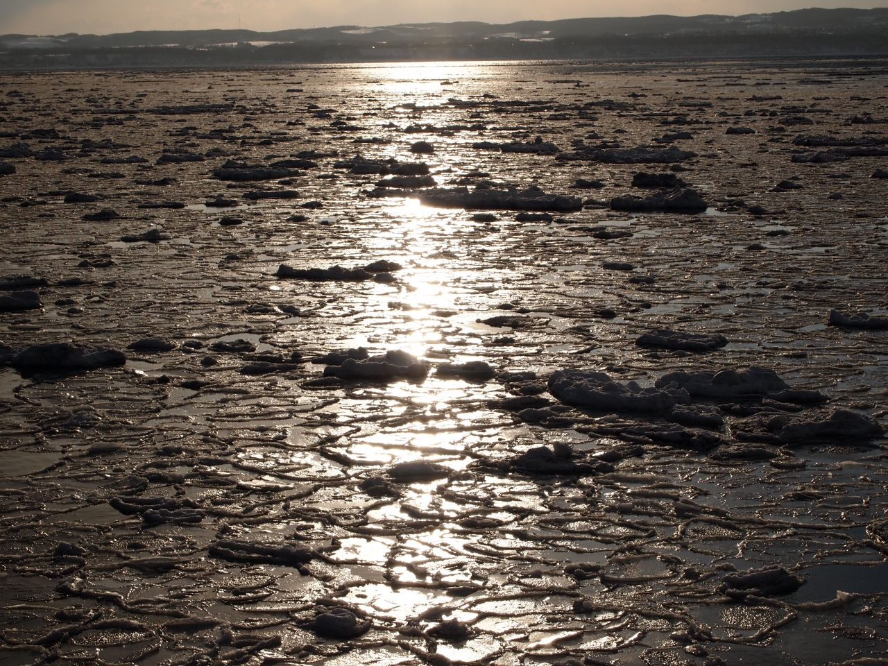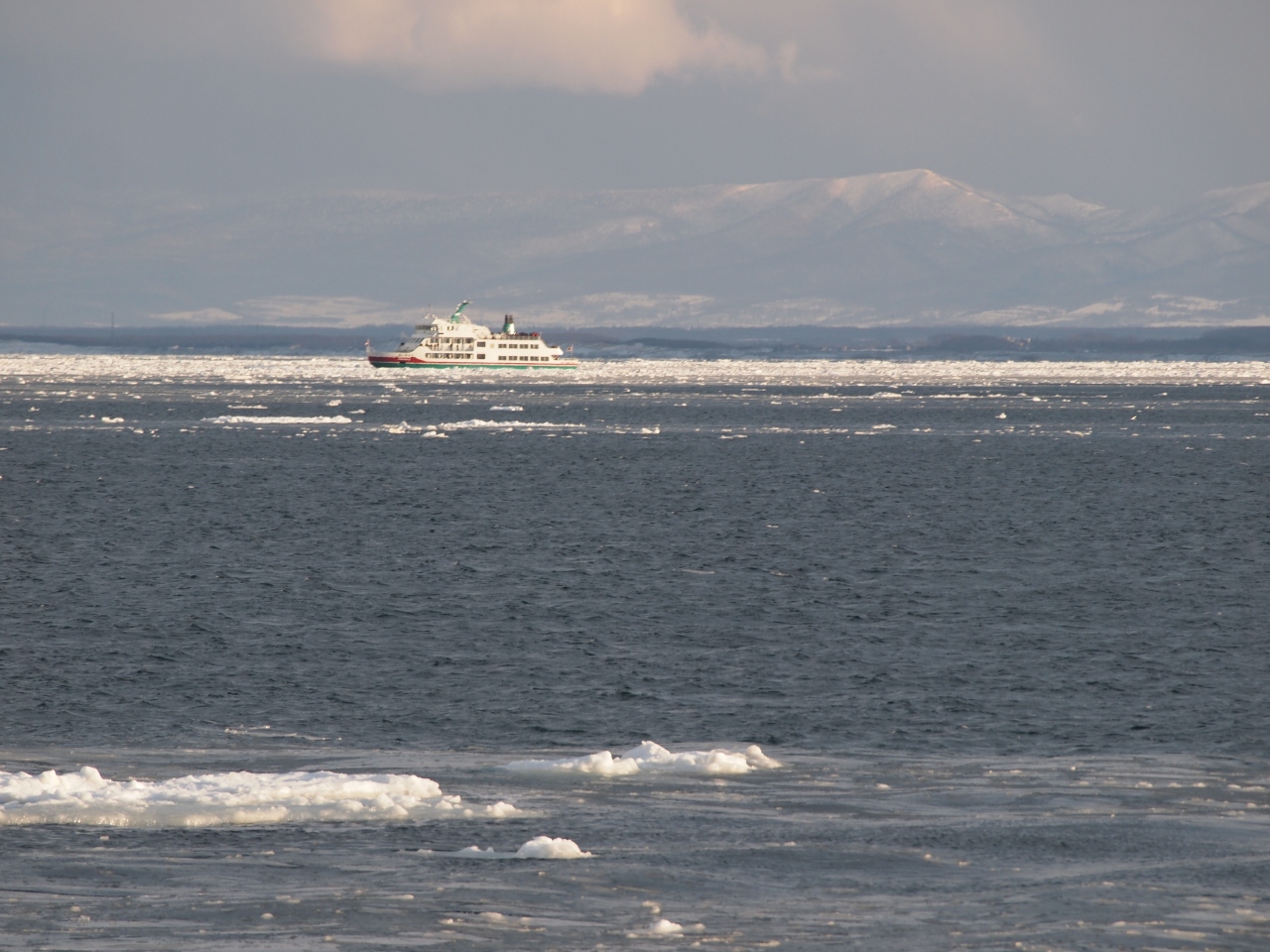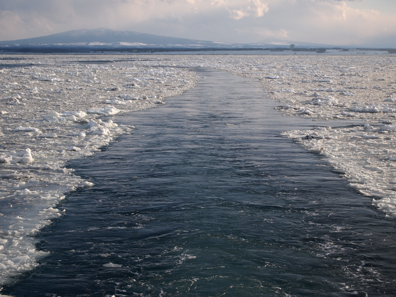オホーツク海に強い低気圧がはりだして南風が強まってきた日の午後に訪れました。前日まで岸壁までびっしりあった流氷は沖に流されつつありましたが、船で追いかけるようにしてなんとか薄めの流氷を観測できました。