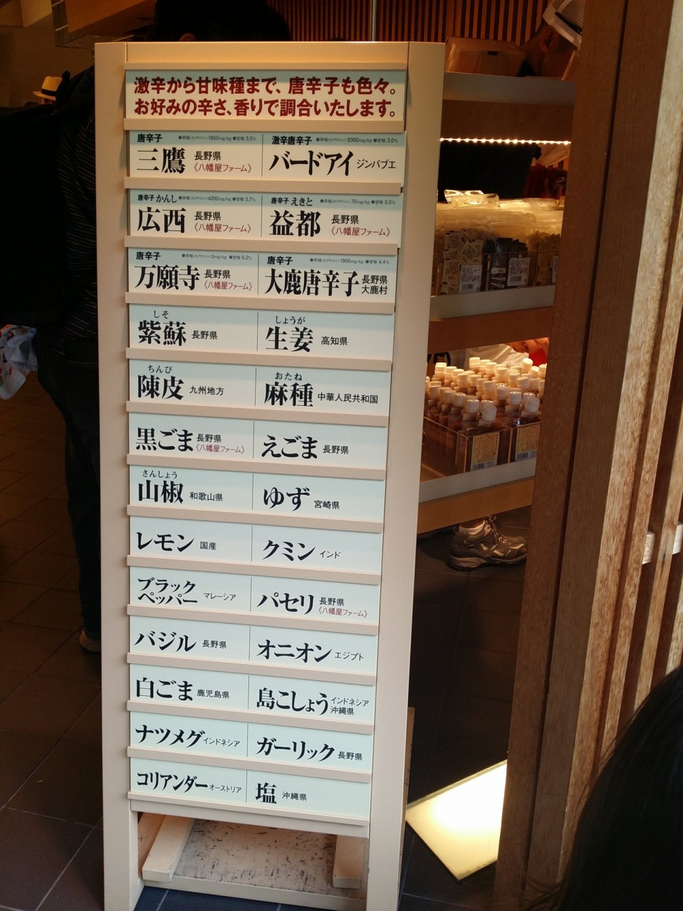 長野市内のスーパーやコンビニでも手に入る八幡屋磯五郎ですが、善光寺の参道にあるこちらの店舗では、好きな素材を選んで調合するオリジナルの七味を作ることができました。