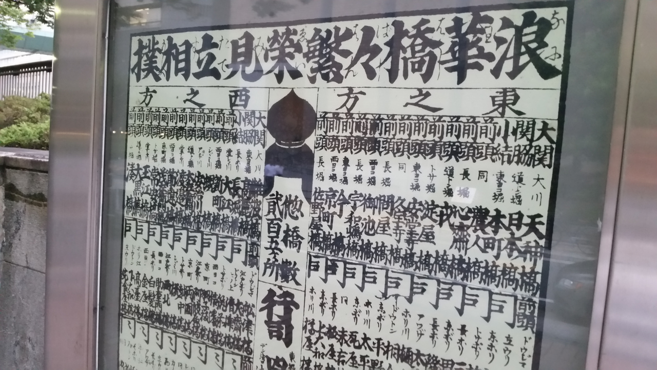 橋の北詰には、「浪華橋々繁栄見立相撲」という橋の番付表があります。江戸時代に通行量を番付にしたそうです。