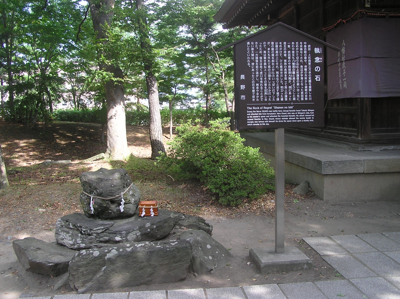 「逆槐」は、武田軍が槐の木を逆茂木として逆さに打ち込んだものが、芽を出し大樹になったもの。「執念の石」は、武田本陣に上杉謙信が乱入するという最大のピンチにおいて、原虎胤が槍で謙信を突いたが取り逃がし、無念さから槍を突き刺したという石で、中央に穴があいている。