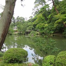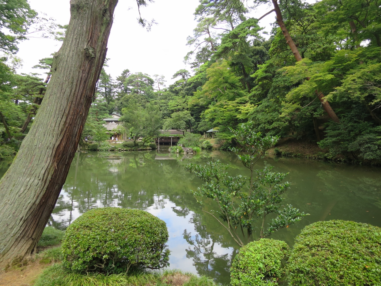 金沢 兼六園を真弓坂から上がって行くと最初に目に入る池です。兼六園の中では2番目に大きな池で、池の形がくびれており瓢箪の様な形をしていることから瓢(ひさご)池と言われるそうです、池には亀島があり、亀島には加藤清正が朝鮮から持ち帰ったと言われる海石塔が建っています。緑の綺麗な落ち着いた庭池です。