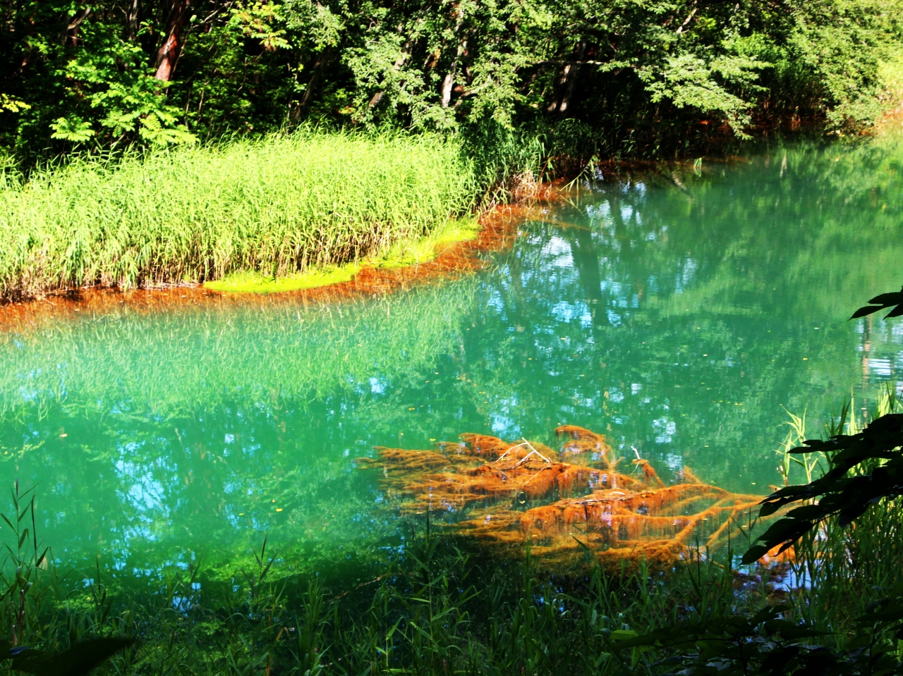 とはいうものの、酸とアルアリの化学反応で緑色や青色の未知の物質が作り出され、沼水の中にその色が溶けだしているわけではありません。