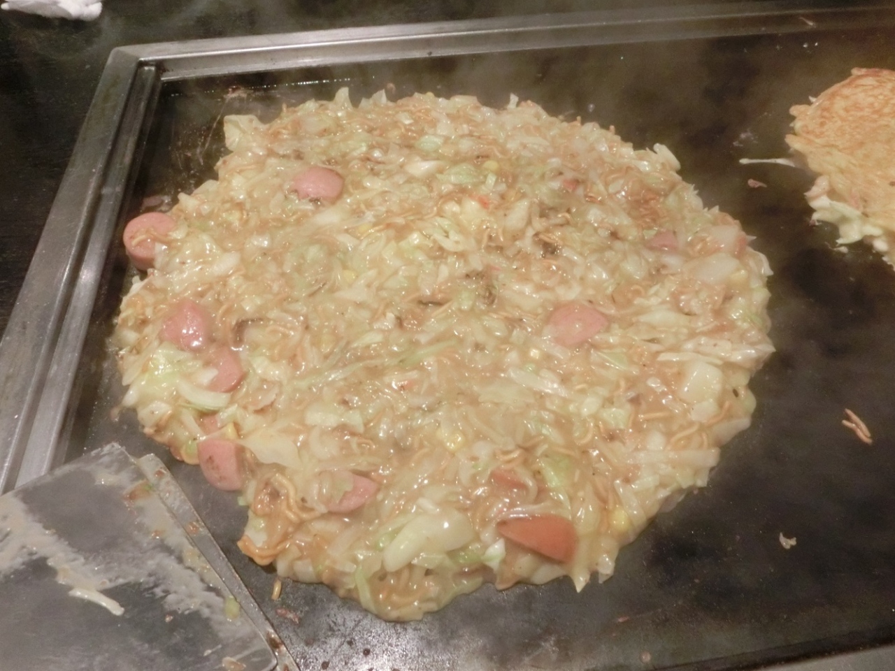 平日のお昼少し前の時間でしたが、店内はかなり混んでいました。私たちはもんじゃとお好み焼きなどを注文、もんじゃなどは各テーブルの鉄板でお店の人が作ってくれます。